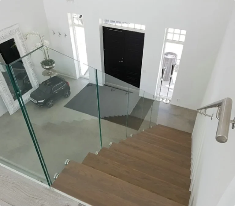Glasräcke med 6 + 6 dubbelhärdad lamellglas. Punktinfästning 50 mm i diameter. Kan fås med överliggare i rostfritt stål eller aluminium.